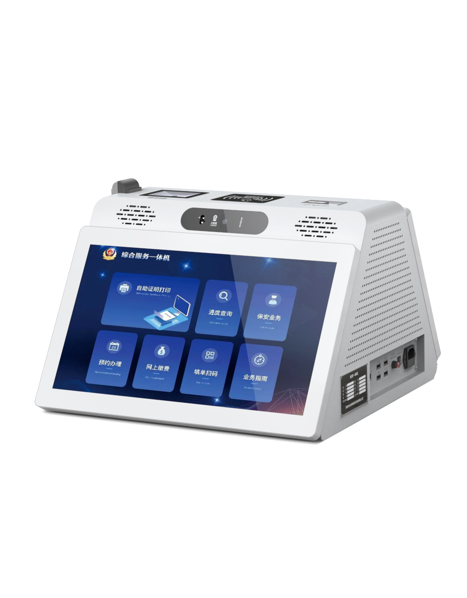 根据窗口柜员与办事群众面对面服务特点,运用“互联网技术”,将 电脑主机、显示器、二代证身份证读卡器、社保卡读卡器、高拍仪、 高清摄像头、凭条打印机、扬声器、叫号器、评价器等硬件合为一体, 称之为窗口一体机。