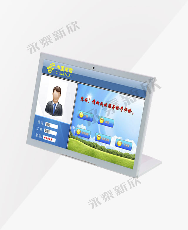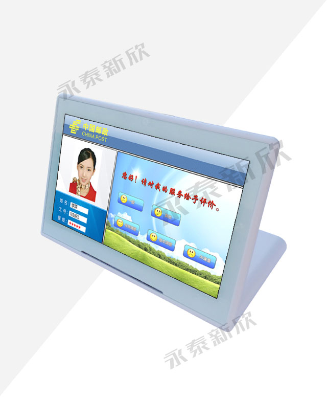 10英寸高清LCD显示一体屏,显示画面更细腻、触摸更灵敏 10英寸多点式电容触摸屏,评价档位可自由设置 流线型设计,造型流畅,符合人体工学 平板电脑级别的触摸体验,显示清晰,手感舒适 可显示日期,时间,可播放图片或视频动画等格式 评价信息实时在线统计并自动生成报表,减少工作量 所有评价统计信息均可远程互联网查询,并设有多级查询