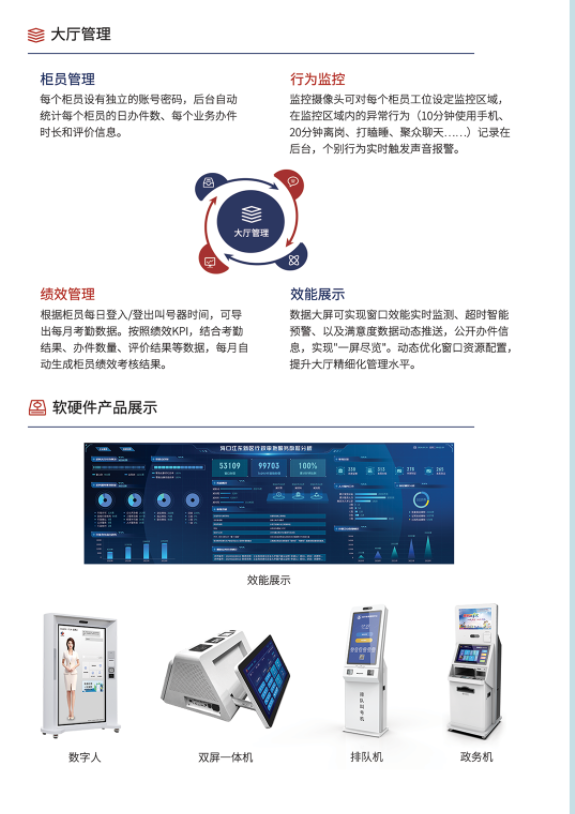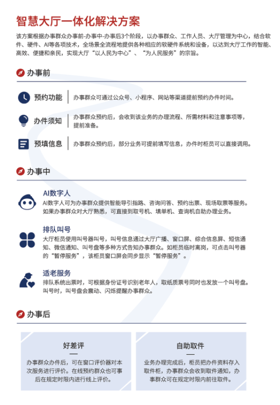 智慧大厅一体化解决方案:根据办事群众办事前·办事中·办事后3个阶段,以办事群众、工作人员、大厅管理为中心,结合软件、硬件、AI等各项技术,全场景全流程地提供各种相应的软硬件系统和设备,以达到大厅工作的智能、高效、便捷和亲民,实现大厅“以人民为中心”“为人民服务”的宗旨