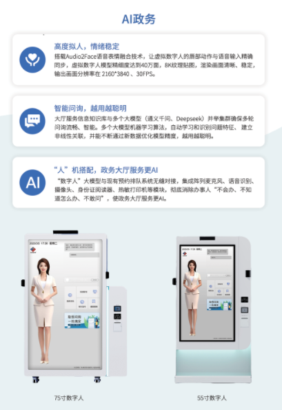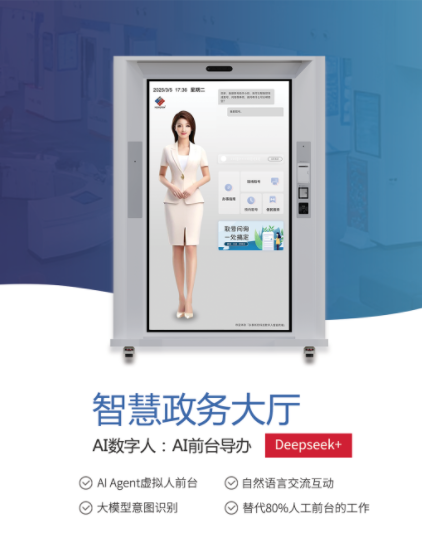AI数字人导办机:依托大模型AI算力,配以各部门专业知识库,智能且专业,相当于一个资深的专家级前台导办,自然语言交流,人性、亲民,图文并茂展示,直观,可替代80%人工前台的工作。提供7×24小时在线咨询、业务引导、材料预审服务;同时,集成语音交互咨询、多业务智能分流排队、实时信息展示、数据统计分析等功能,以 AI 技术实现全流程智能服务,有效解决群众办事咨询难、流程复杂等痛点,大幅提升政务办理效率与群众体验。